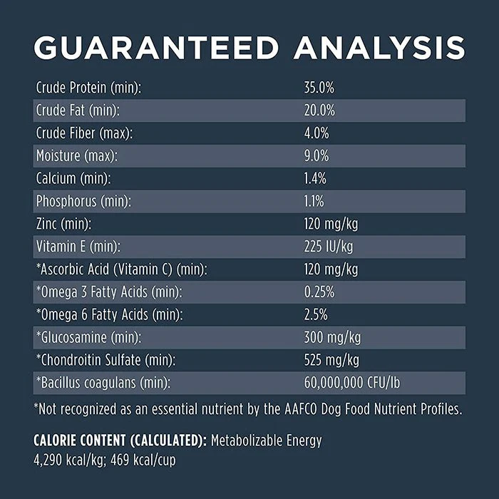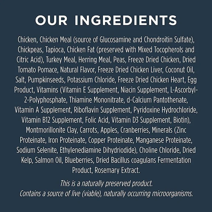 成分:雞肉,雞肉粉(葡萄糖胺及硫酸軟骨素來源),鷹嘴豆,木薯,雞脂肪(以維生素E及檸檬酸保存),火雞肉粉,鯡魚粉,豌豆,凍乾雞肉,乾燥番茄碎粒,天然香料,凍乾雞肝,椰子油,鹽,南瓜籽,氯化鉀,凍乾雞心,蛋製品,維生素群(維生素E,菸鹼酸,L-抗壞血酸-2-多聚磷酸鹽,維生素B1,維生素B5,維生素A,維生素B2,維生素B6,維生素B12,維生素B9,維生素D3,維生素B7),蒙脫石粘土,紅蘿蔔,蘋果,蔓越莓,礦物質(鋅蛋白鹽,鐵蛋白鹽,銅蛋白鹽,錳蛋白鹽,亞硒酸鈉,乙二胺二氫碘化物),氯化膽鹼,乾燥海帶,鮭魚油,藍莓,乾燥芽孢乳酸菌,迷迭香萃取物
